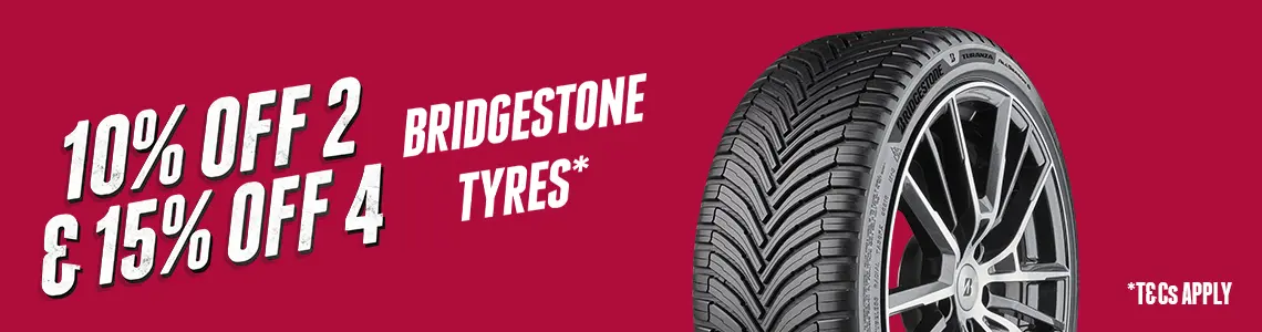 - 10% off 2-3 & 15% off 4 Bridgestone tyres ends midnight Saturday 28th February 2026.